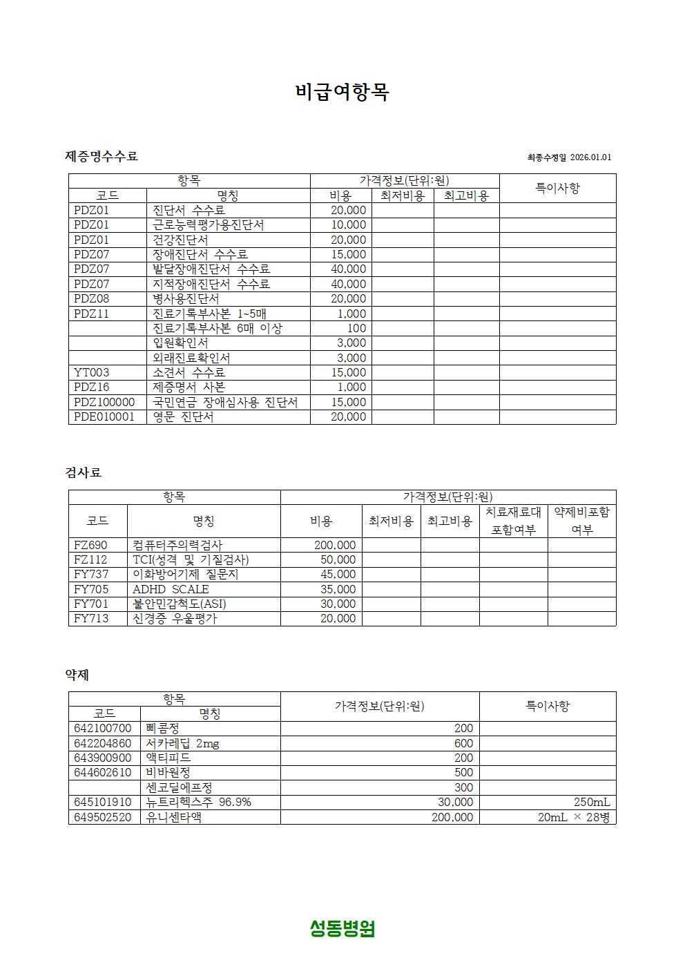 제증명 수수료 및 비급여 항목 비용 안내